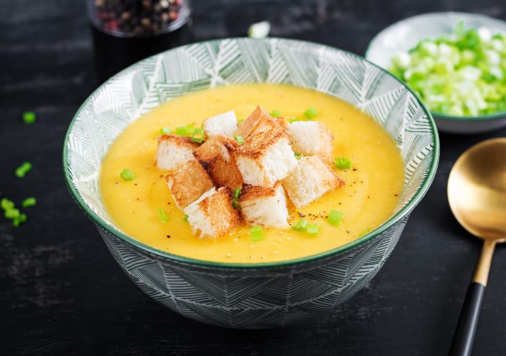 - Versare il passato di verdure nei piatti, aggiungere i crostini e condire con olio crudo a filo.